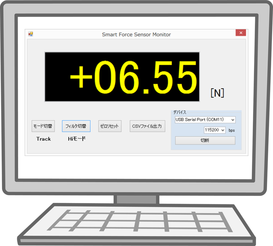スマートフォースセンサをSFSAUSB1(USB変換ボード)を使ってPCに接続したとき、PC側で出力を表示させることができます。 |